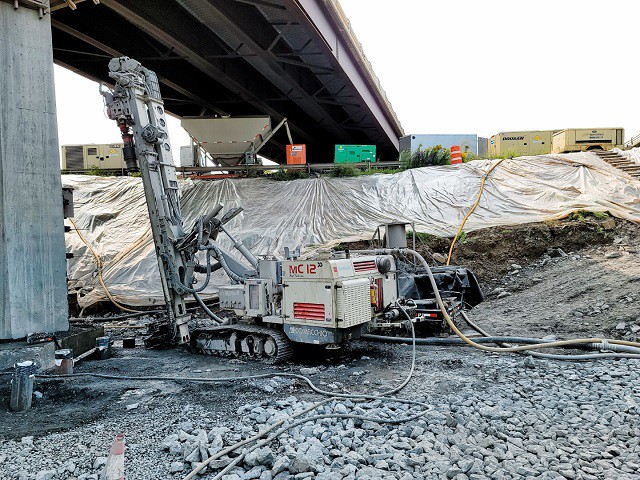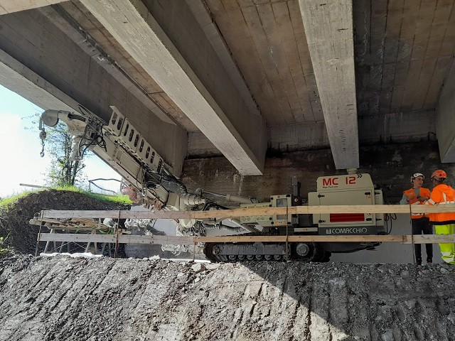 The MC 12 is a versatile and powerful hydraulic drilling rig designed for civil engineering works such as micropiles, anchors, jet grouting and ground improvement in general. The rig’s patented mast articulation ability, compact size and variety of mast positions and inclinations allow for operation even in confined spaces. The optional addition of a slewing ring makes it suitable for the execution of special geotechnical works inside tunnels as well. Equipped with advanced modular hydraulic circuits, the MC 12 can utilize a wide range of rotary heads, hydraulic drifters, double head systems, water and mud pumps and is suitable for rotary or rotary-percussive drilling. The machine can be equipped with hydraulic proportional servo-assisted controls or with radio control. Like all Comacchio rigs, the MC 12 can be customized according to the specific needs.