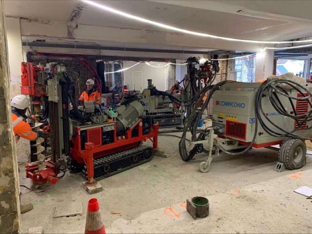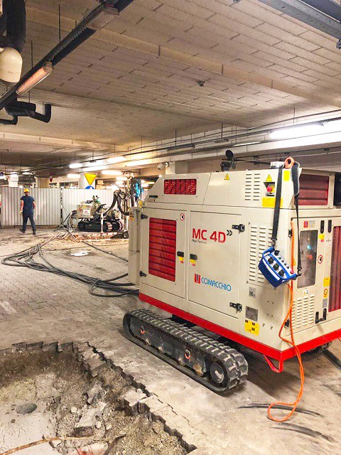 The MC 4 D is a hydraulic drilling rig with separate power pack, specifically designed for the execution of ground engineering works in confined or low overhead spaces and difficult access jobsites, inside buildings, basements and small tunnels. This is possible due to the rig’s wide range of allowable movements in addition to the telescopic mast adjustment, which is available as an option. Depending on the job site requirements, this machine can be supplied with a soundproof diesel power pack or with electric power pack. Thanks to the use of advanced modular hydraulic circuits, the MC 4D can accommodate a wide range of accessories and is suitable for any type of rotary or rotary-percussive drilling. The machine can be equipped with hydraulic proportional servo-assisted controls or with the innovative Comacchio radio control system. Like all Comacchio machines, the MC 4D can be customized according to specific needs.